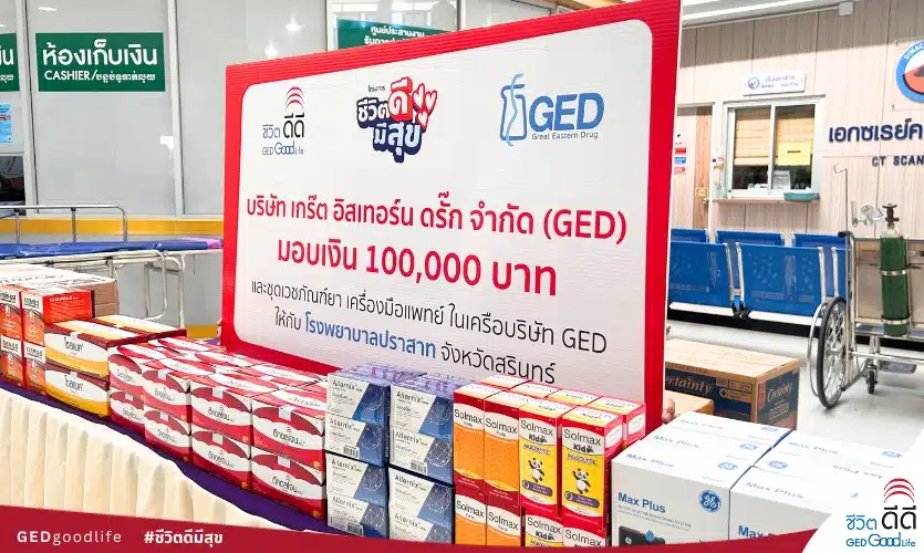 โดยมีเภสัชกรพิศม์พงศ์ พงศ์พานิช ผู้จัดการทั่วไป บริษัท GED และคณะผู้บริหาร เป็นผู้แทนส่งมอบให้ แพทย์หญิงชูหงส์ มหรรทัศนพงศ์ ตำแหน่งผู้อำนวยการโรงพยาบาลปราสาท เพื่อนำไปช่วยเหลือ บรรเทาทุกข์ ผู้ที่ประสบภัยและผู้ป่วยต่อไป